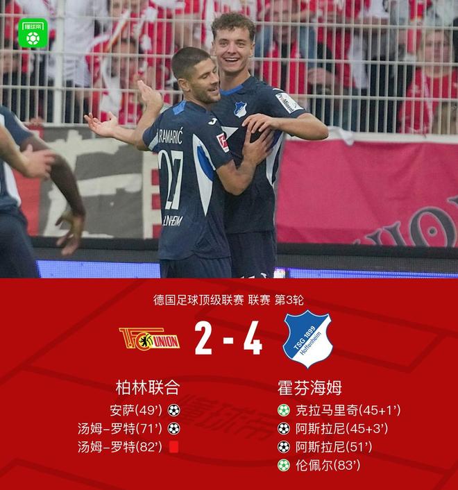 霍芬海姆4-2十人柏林联合,阿斯拉尼双响,伦佩尔传射